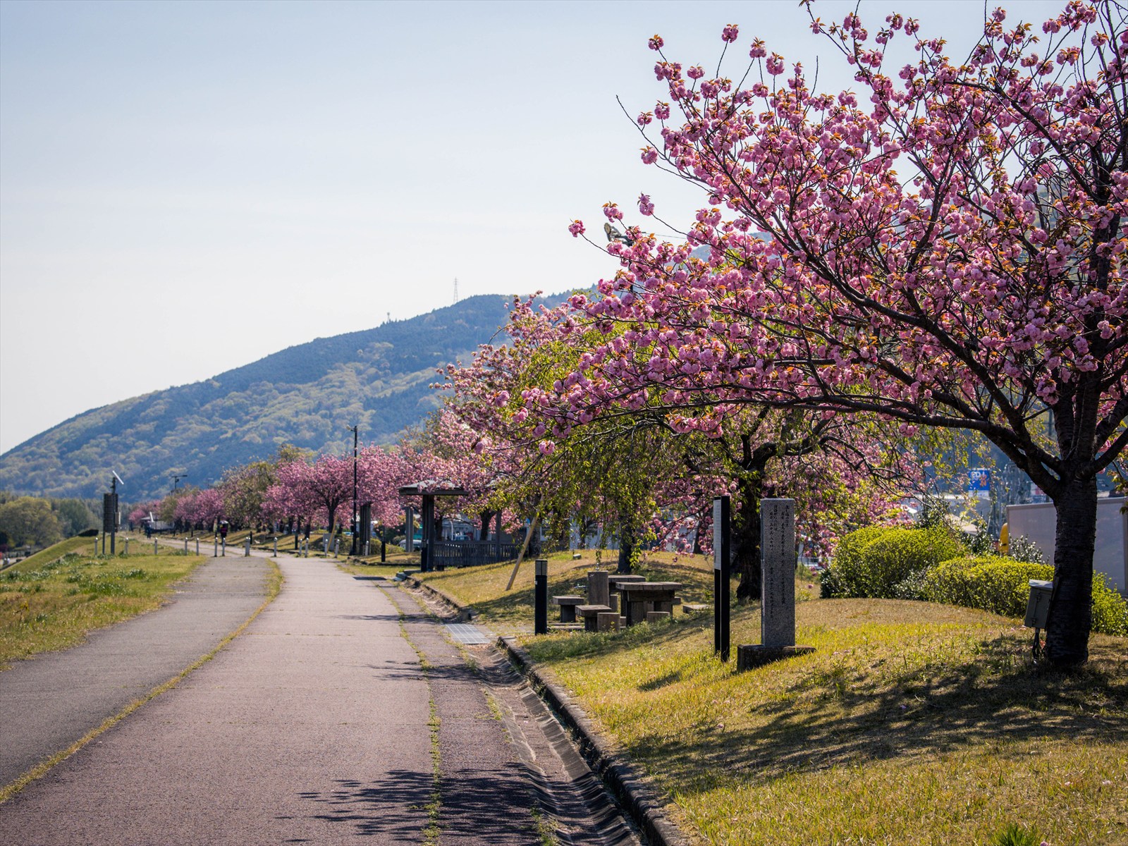 道の駅貞光ゆうゆう館前の国道に面した、堤防沿いのウォーキングコースです🚶🏻🌸吉野川と八重桜を眺めながら、ゆったりとお散歩を楽しむことができます。