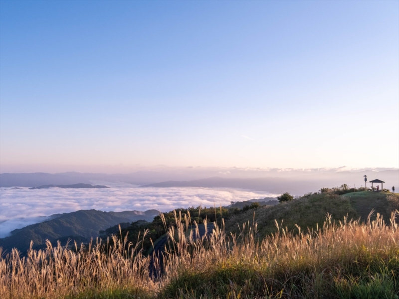 秋から春にかけての早朝には、足元には厚く迫力のある雲海が広がり、まるで空に浮かぶ大地のような幻想的な光景が訪れる人の心を魅了します。