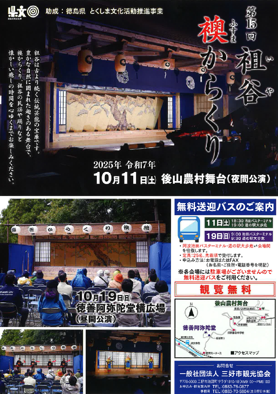住所 | 後山農村舞台:徳島県三好市西祖谷山村後山289 徳善阿弥陀堂横広場:徳島県三好市西祖谷山村徳善110 |