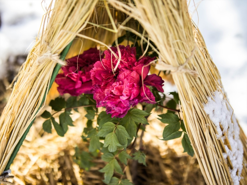 • 藁ぼっちと冬牡丹:自然と調和した稲藁の藁ぼっちの中で美しく咲く冬牡丹が、訪れる方々を癒します。