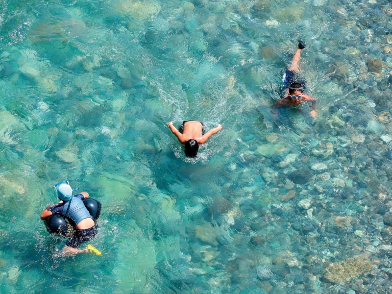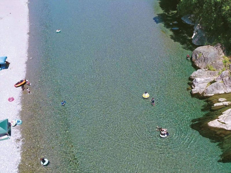 川底まで見えるほど澄んだ水と、エメラルドグリーンに輝く水面が印象的です。
