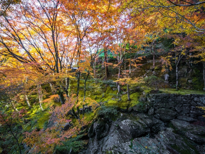 また本堂の裏手にある日本庭園は滝や緑の苔に包まれた心落ち着く場所となっております。秋には境内に植えられたもみじが赤く染まり、より一層美しい庭園を楽しむことが可能です。