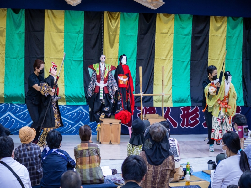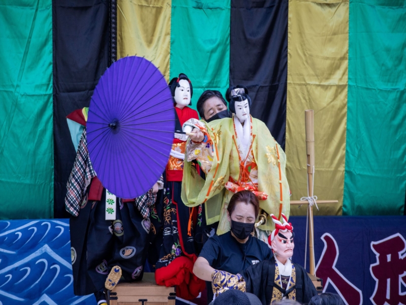 An exceptionally rare ningyo joruri puppet theatre, held within the grounds of Funato Shrine in Higashiyama Aza Hoichi.