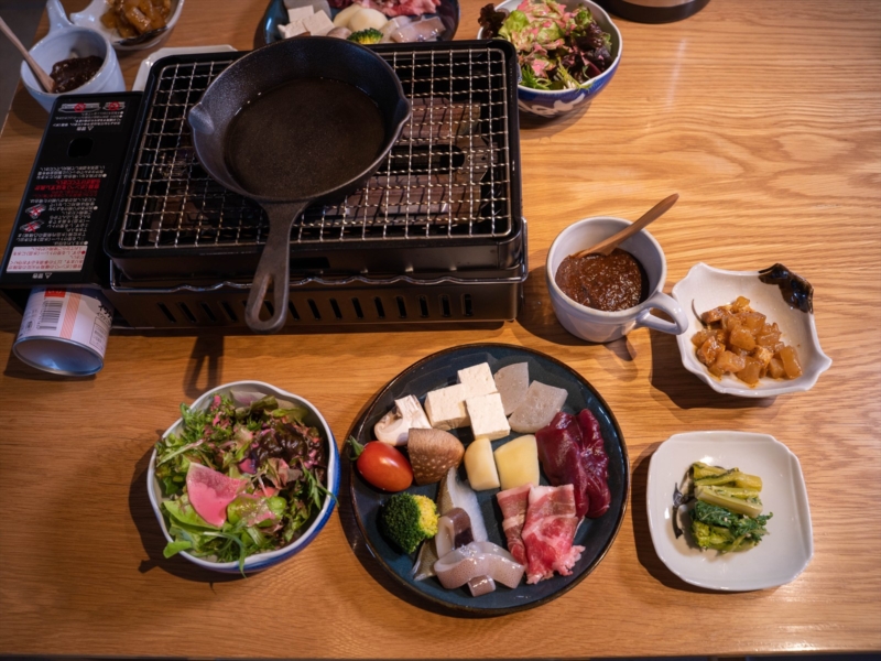 Experience "hirara-yaki" barbeque, found only in Miyoshi! "Hirara" refers to the old way of cooking on flat river rocks. Try the local bounty of fish, konnyaku, tofu and veggies cooked in rich miso. You can also sample 3 kinds of Miyoshi's local sake.