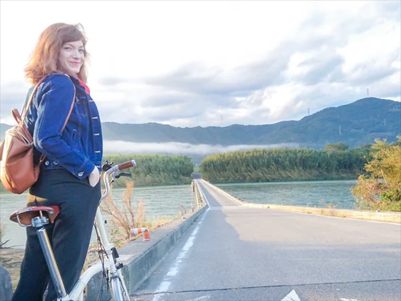 As you cycle through the town, you’ll spot the retro Odeon Theater across the Otani River—the charming venue featured in the film “The Man Who Caught the Rainbow” (Niji o Tsukamu Otoko, 1996). Thanks to the attention the movie brought to it, the theater was restored and later designated as a cultural landmark. The route then leads you along a quiet levee road with no cars, crossing over to Anabuki. Here, you can take a break on the riverside of the Anabuki River, known as Japan’s clearest stream. The course continues through Mainakashima, once a major indigo production area, before crossing a traditional low-water bridge back toward the townscape.