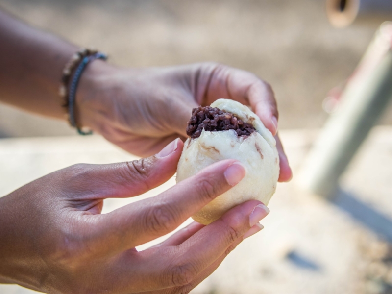 小麦粉を練って生地を作り、自家製小豆のあんこや栗のあんこ、ソラマメや小さなじゃがいもを使ったあんこなど、季節に応じた旬のものをあんこにしてまんじゅうに入れます。かまどで薪を使ってお湯を沸かし、蒸しあげれば、もちもちのまんじゅうが完成。自家製のお茶とともにいただきましょう。余ったまんじゅうはお持ち帰りいただけます。