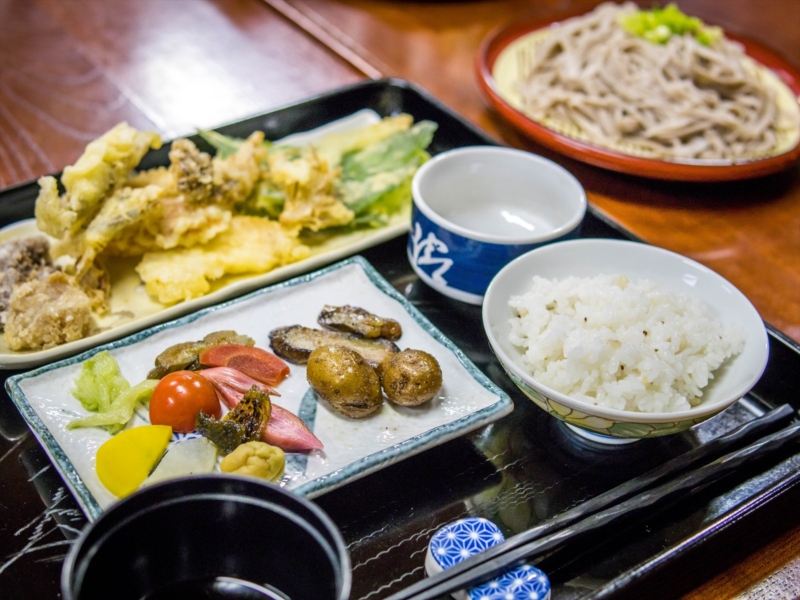 そば打ち体験+山菜御膳(山菜、鹿肉、じゃがいも、豆腐、麦飯など)