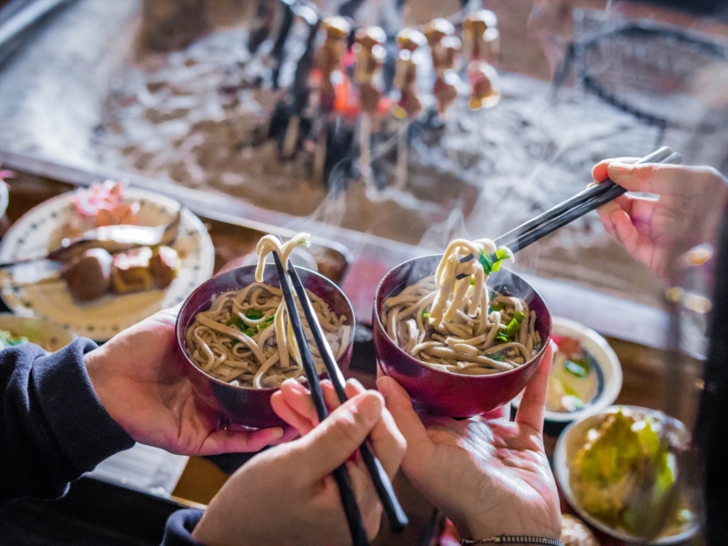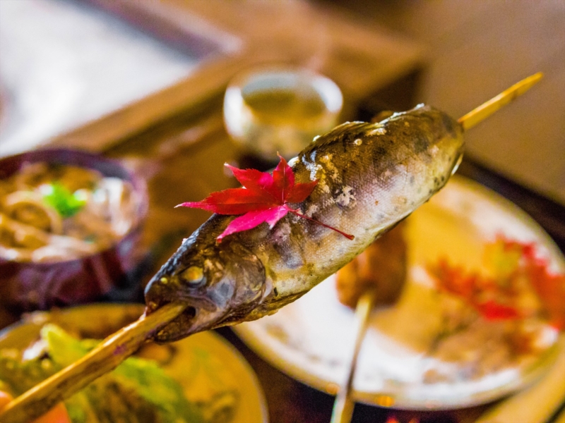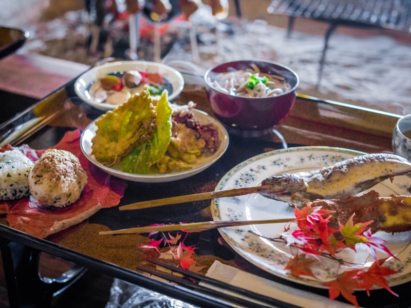 約250年前に建てられた祖谷地方で最も大きな武家屋敷で、祖谷地方の伝統的な郷土料理を食べられます。囲炉裏で炙られているのは、清流に棲むアメゴと、串に刺したじゃがいも、石豆腐、こんにゃくに味噌を塗った「でこまわし」という料理。お膳には、祖谷そば、季節の山菜の天ぷら、鹿肉の竜田揚げ、こんにゃくの唐揚げ、傾斜地農法で採れた野菜のおかずなどがたっぷり。素朴な調理法が、ぎゅっと凝縮された素材の味を引き出しています。