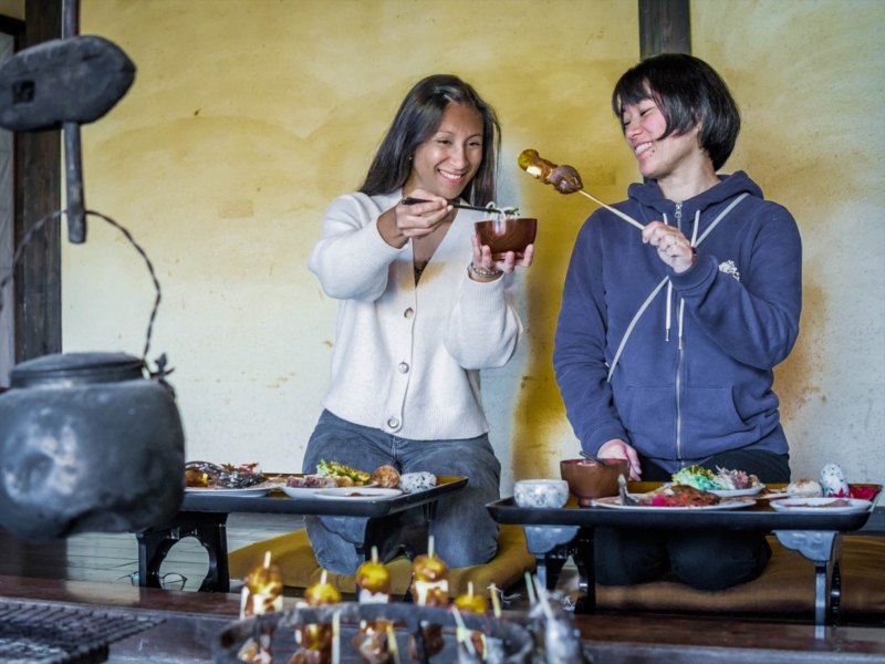 かやぶき屋根の見事な「武家屋敷・旧喜多家」で祖谷の伝統的な郷土食を味わうことができるプランです。由緒ある建物の中で、囲炉裏を囲み、その土地の料理をいただく特別な時間をお過ごしください。